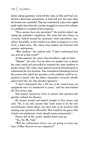 before asking questions. Corin left the room, as Tom and Paul con- ducted a three-hour presentation. A hush fell over the room when the lecture was concluded. Tom was reminded of a day in his eighth grade math class when the teacher struggled to convey her solution to a problem to a roomful of lost recipients.
