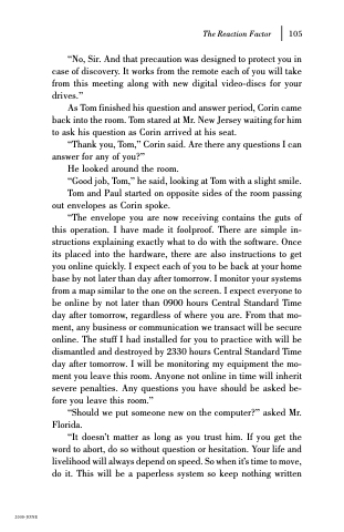 this operation. I have made it foolproof. There are simple in- structions explaining exactly what to do with the software. Once its placed into the hardware, there are also instructions to get you online quickly. I expect each of you to be back at your home base by not later than day after tomorrow. I monitor your systems from a map similar to the one on the screen. I expect everyone to be online by not later than 0900 hours Central Standard Time day after tomorrow, regardless of where you are. From that mo- ment, any business or communication we transact will be secure online. The stuff I had installed for you to practice with will be dismantled and destroyed by 2330 hours Central Standard Time day after tomorrow. I will be monitoring my equipment the mo- ment you leave this room. Anyone not online in time will inherit severe penalties. Any questions you have should be asked be- fore you leave this room.”