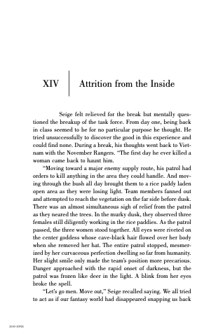 Seige felt relieved for the break but mentally ques- tioned the breakup of the task force. From day one, being back in class seemed to be for no particular purpose he thought. He tried unsuccessfully to discover the good in this experience and could find none. During a break, his thoughts went back to Viet- nam with the November Rangers. “The first day he ever killed a woman came back to haunt him.