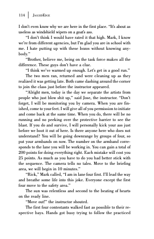 “Alright men, today is the day we separate the artists from people who just blow shit up,” said Jose, the instructor. “Don’t forget, I will be monitoring you by camera. When you are fin- ished, come to your feet. I will give all of you permission to initiate and come back at the same time. When you do, there will be no running and no peeking over the protective barrier to see the blast. If you do and survive, I will personally kick your ass just before we boot it out of here. Is there anyone here who does not understand? You will be going downrange by groups of four, so put your armbands on now. The number on the armband corre- sponds to the lane you will be working in. You can gain a total of 200 points for doing everything right. Each mistake will cost you 25 points. As much as you have to do you had better stick with the sequence. The camera tells no tales. Move to the briefing area, we will begin in 10 minutes.”