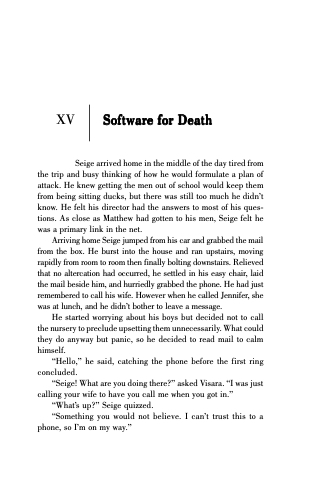 Seige arrived home in the middle of the day tired from the trip and busy thinking of how he would formulate a plan of attack. He knew getting the men out of school would keep them from being sitting ducks, but there was still too much he didn’t know. He felt his director had the answers to most of his ques- tions. As close as Matthew had gotten to his men, Seige felt he was a primary link in the net.