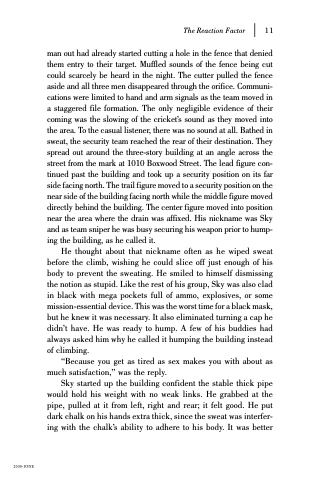 He thought about that nickname often as he wiped sweat before the climb, wishing he could slice off just enough of his body to prevent the sweating. He smiled to himself dismissing the notion as stupid. Like the rest of his group, Sky was also clad in black with mega pockets full of ammo, explosives, or some mission-essential device. This was the worst time for a black mask, but he knew it was necessary. It also eliminated turning a cap he didn’t have. He was ready to hump. A few of his buddies had always asked him why he called it humping the building instead of climbing.