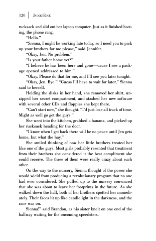 On the way to the nursery, Sienna thought of the power she would wield from producing a revolutionary program that no one had ever considered. She pulled up to the nursery convinced that she was about to leave her footprints in the future. As she walked down the hall, both of her brothers spotted her immedi- ately. Their faces lit up like candlelight in the darkness, and the race was on.