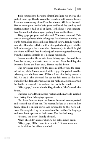 The boys sang along with the radio as if they were the origi- nal artists, while Sienna smiled at their joy. She pulled into the driveway, and the boys took off like a flash after being unbuck- led. As usual, she checked the car for left items as the boys waited by the door. After replacing her rucksack, Sienna carried her brothers’ discarded items from the car to the porch.