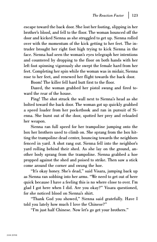escape toward the back door. She lost her footing, slipping in her brother’s blood, and fell to the floor. The woman bounced off the door and kicked Sienna as she struggled to get up. Sienna rolled over with the momentum of the kick getting to her feet. The in- truder brought her right foot high trying to kick Sienna in the face. Sienna had seen the woman’s eyes telegraph her intentions and countered by dropping to the floor on both hands with her left foot spinning vigorously she swept the female hard from her feet. Completing her spin while the woman was in midair, Sienna rose to her feet, and renewed her flight towards the back door.
