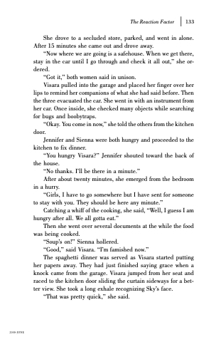 her papers away. They had just finished saying grace when a knock came from the garage. Visara jumped from her seat and raced to the kitchen door sliding the curtain sideways for a bet- ter view. She took a long exhale recognizing Sky’s face.