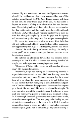 Meanwhile, Seige was waiting on the remaining seconds to elapse before the fireworks started. He knew that only two of the men on his task force were Vietnam veterans, but he trusted them all to be where they were supposed to be and do their job. He was excited that they were going to actually hit the headquar- ters of the Blue Heaven drug operation. How often does anyone get a break like this one? He must be blessed he thought. To bring down the king of the newest designer drug known to man- kind, and here he was poised to strike, it was too much to hope for. Even though the intelligence came from outside their circle, he tried to remain positive. This was going to be the big hit, and his task force was going to be the ones to do it. He felt proud as he raised his sleeve to check his watch covered in his congealed sweat like jello. Just a half a minute to go. Sky was chuckling to