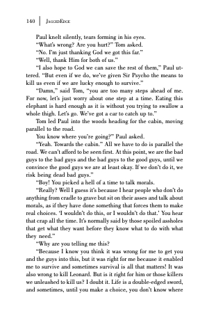 “Because I know you think it was wrong for me to get you and the guys into this, but it was right for me because it enabled me to survive and sometimes survival is all that matters! It was also wrong to kill Leonard. But is it right for him or those killers we unleashed to kill us? I doubt it. Life is a double-edged sword, and sometimes, until you make a choice, you don’t know where