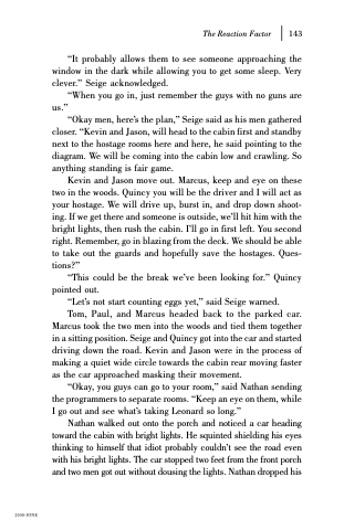 Kevin and Jason move out. Marcus, keep and eye on these two in the woods. Quincy you will be the driver and I will act as your hostage. We will drive up, burst in, and drop down shoot- ing. If we get there and someone is outside, we’ll hit him with the bright lights, then rush the cabin. I’ll go in first left. You second right. Remember, go in blazing from the deck. We should be able to take out the guards and hopefully save the hostages. Ques- tions?”