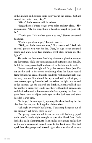 in the kitchen and go from there to my car in the garage. Just act normal the entire time, okay?”