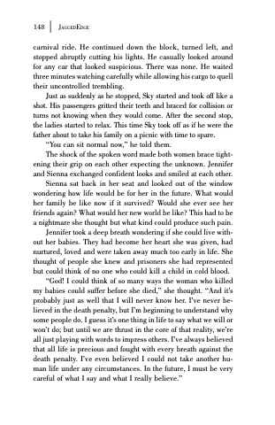 “God! I could think of so many ways the woman who killed my babies could suffer before she died,” she thought. “And it’s probably just as well that I will never know her. I’ve never be- lieved in the death penalty, but I’m beginning to understand why some people do. I guess it’s one thing in life to say what we will or won’t do; but until we are thrust in the core of that reality, we’re all just playing with words to impress others. I’ve always believed that all life is precious and fought with every breath against the death penalty. I’ve even believed I could not take another hu- man life under any circumstances. In the future, I must be very careful of what I say and what I really believe.”