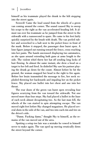 The rear doors of the green van burst open revealing four figures scurrying from the van toward the sidewalk. Not one moved more than four steps. Sky had placed a bullet in the base of each neck almost decapitating two. As the last man fell, the wheels of the van started to spin attempting escape. The van moved eight feet before Sky changed magazines. He placed sev- eral shots in the side of the van, and two into each rim and tire on the driver’s side.