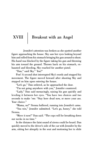 Jennifer’s attention was broken as she spotted another figure approaching the house. Sky saw her eyes looking beyond him and rolled from his stomach bringing his gun around to shoot. His hand was blocked by the figure taking his gun and throwing his arm toward the ground. Thrown back on his stomach, ex- hausted and bleeding, Sky reached for another pistol.