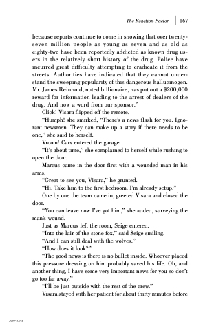 because reports continue to come in showing that over twenty- seven million people as young as seven and as old as eighty-two have been reportedly addicted as known drug us- ers in the relatively short history of the drug. Police have incurred great difficulty attempting to eradicate it from the streets. Authorities have indicated that they cannot under- stand the sweeping popularity of this dangerous hallucinogen. Mr. James Reinhold, noted billionaire, has put out a $200,000 reward for information leading to the arrest of dealers of the drug. And now a word from our sponsor.”