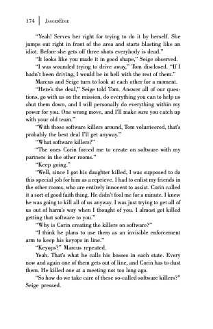 “Well, since I got his daughter killed, I was supposed to do this special job for him as a reprieve. I had to enlist my friends in the other rooms, who are entirely innocent to assist. Corin called it a sort of good faith thing. He didn’t fool me for a minute. I knew he was going to kill all of us anyway. I was just trying to get all of us out of harm’s way when I thought of you. I almost got killed getting that software to you.”