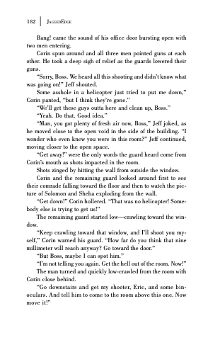 “Keep crawling toward that window, and I’ll shoot you my- self,” Corin warned his guard. “How far do you think that nine millimeter will reach anyway? Go toward the door.”