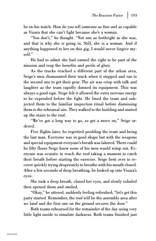 Five flights later, he regretted prodding the team and being the last man. Everyone was in good shape but with the weapons and special equipment everyone’s breath was labored. There could be fifty floors Seige knew none of his men would wimp out. Ev- eryone was ecstatic to reach the roof taking a moment to catch their breath before starting the exercise. Seige bent over to re- cover quickly trying desperately to breathe with his mouth closed. After a few seconds of deep breathing, he looked up into Visara’s eyes.