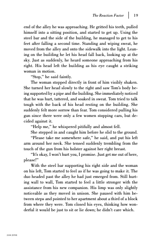 With the steel bar supporting his right side and the woman on his left, Tom started to feel as if he was going to make it. The duo headed past the alley he had just emerged from. Still hurt- ing wall to wall, Tom started to feel a little stronger with the assistance from his new companion. His limp was only slightly noticeable as they moved in unison. She paused with him be- tween steps and pointed to her apartment about a third of a block from where they were. Tom closed his eyes, thinking how won- derful it would be just to sit or lie down; he didn’t care which.