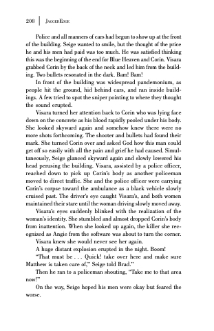 Police and all manners of cars had begun to show up at the front of the building. Seige wanted to smile, but the thought of the price he and his men had paid was too much. He was satisfied thinking this was the beginning of the end for Blue Heaven and Corin. Visara grabbed Corin by the back of the neck and led him from the build- ing. Two bullets resonated in the dark. Bam! Bam!