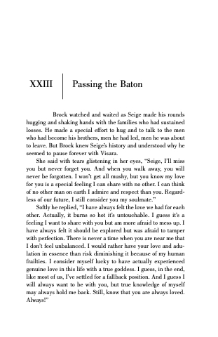 Brock watched and waited as Seige made his rounds hugging and shaking hands with the families who had sustained losses. He made a special effort to hug and to talk to the men who had become his brothers, men he had led, men he was about to leave. But Brock knew Seige’s history and understood why he seemed to pause forever with Visara.