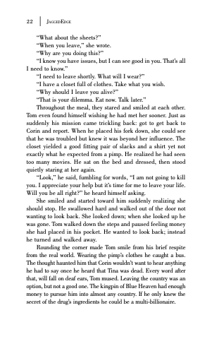 Tom even found himself wishing he had met her sooner. Just as suddenly his mission came trickling back: got to get back to Corin and report. When he placed his fork down, she could see that he was troubled but knew it was beyond her influence. The closet yielded a good fitting pair of slacks and a shirt yet not exactly what he expected from a pimp. He realized he had seen too many movies. He sat on the bed and dressed, then stood quietly staring at her again.
