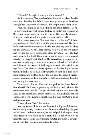 After a few moments, Tom was cleared to the top.” A lump accumulated in Tom’s throat as his gun was removed. He felt a little of the weakness return as he left the security crew heading for the elevator. As the door closed, he pressed the 10 button and wished he were somewhere else, anywhere else. He had only been to the tenth floor once when he was given a special mission; he fought back the fear. He looked into a mirror on the elevator wondering if there was a camera behind it. He looked confident and was ready. A bell ring announced his arrival at the top floor. The elevator doors opened to display high leather trimmed double doors flanked by guards on each end. Tom knew both guards, and neither he nor the two guards changed expres- sion or greetings as he approached. Both men grabbed handles and swung the doors open.