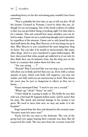 “Now is probably the best time as any to tell you this. Of all the lessons I learned in Vietnam, I need to share this one, al- though it’s not encouraging. One of the harsh realities of combat is that you can get killed doing everything right! Let that sink in for a minute. Now ask yourself how many mistakes you can af- ford to make. I know its not a comforting thought and it shouldn’t be regardless of the mission. I know you’ve only heard the stan- dard stuff about the drug, Blue Heaven, so let me bring you up to date. Blue Heaven is now considered the most dangerous drug we know. You can take it by mouth or intravenously, like many other drugs. And it is now considered a super hallucinogen. We have discovered that when people get addicted to it not only do they think they can do fantastic feats, but the drug acts on the brain in a manner that makes them feel they can.