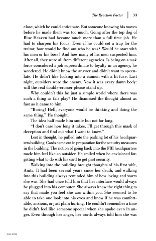 Lost in thought, he pulled into the parking lot of his headquar- ters building. Cards came out in preparation for the security measures in the building. The notion of going back into the FBI headquarters made him feel like an outsider. He smiled when he envisioned for- getting what to do with his card to get past security.