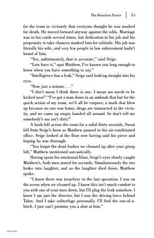 “I don’t mean I think there is one. I mean ass needs to be kicked now!” “I’ve got a man down in an ambush that but for the quick action of my team, we’d all be corpses; a mark that blew up because no one was home; drugs are transacted in the vicin- ity, and we came up empty handed all around. So don’t tell me somebody’s ass isn’t dirty!”