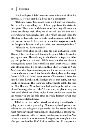 “When I was a kid, I used to race my bike a lot. And a lesson I learned then fared me well through the years. When the road is wet, up the ante. The only way to win then is to forget the other guy and go balls to the wall. While everyone else out there is slowing down, cause they’re thinking about their own ass, that’s your striking zone. It’s no different than when we were in Nam. You know what happens when you and the enemy surprise each other at the same time. After the initial shock, the one that stays frozen is SOL and I don’t mean statute of limitations. I know I’m just the head honcho in the background of this outfit, but your head’s no different. This team was put together to get the top man for Blue Heaven. We’ve hurt him bad and hope he will expose himself coming after us. I don’t know how you plan to stop the leak or take back the offensive, but I have confidence in you. It’s the reason you are the only other one with decision power over this experimental task force.