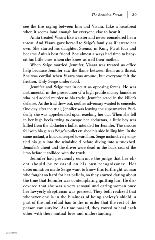 Jennifer and Seige met in court as opposing forces. He was instrumental in the prosecution of a high profile money launderer who had added murder to his trade. Jennifer acted in the killer’s defense. As the trial drew out, neither adversary wanted to concede. One day after the trial, Jennifer was leaving the supermarket. Sud- denly she was apprehended upon reaching her car. When she fell in her high heels trying to escape her abductors, a little boy was killed from the abductor’s bullet intended for Jennifer. The shooter fell with his gun as Seige’s bullet crushed his side killing him. In the same instant, a limousine sped toward him. Seige instinctively emp- tied his gun into the windshield before diving into a truckbed. Jennifer’s client and the driver were dead in the back seat of the limo before it collided with the truck.