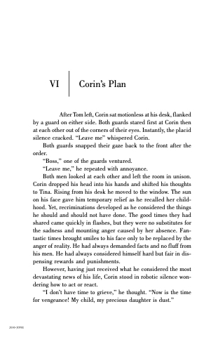 Corin dropped his head into his hands and shifted his thoughts to Tina. Rising from his desk he moved to the window. The sun on his face gave him temporary relief as he recalled her child- hood. Yet, recriminations developed as he considered the things he should and should not have done. The good times they had shared came quickly in flashes, but they were no substitutes for the sadness and mounting anger caused by her absence. Fan- tastic times brought smiles to his face only to be replaced by the anger of reality. He had always demanded facts and no fluff from his men. He had always considered himself hard but fair in dis- pensing rewards and punishments.
