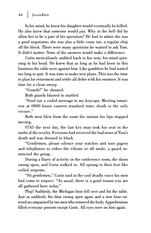Corin meticulously ambled back to his seat, his mind spin- ning in his head. He knew that as long as he had been in this business the odds were against him. Like gamblers he had waited too long to quit. It was time to make new plans. This was the time to plan for retirement and settle all debts with his enemies. It was time for a clean sweep.
