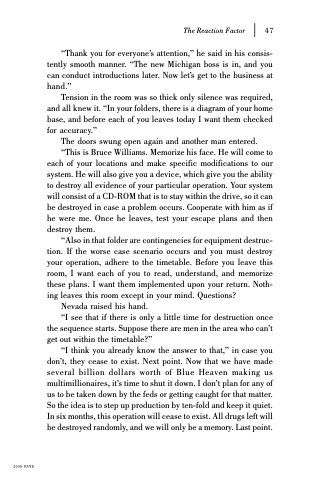 “I think you already know the answer to that,” in case you don’t, they cease to exist. Next point. Now that we have made several billion dollars worth of Blue Heaven making us multimillionaires, it’s time to shut it down. I don’t plan for any of us to be taken down by the feds or getting caught for that matter. So the idea is to step up production by ten-fold and keep it quiet. In six months, this operation will cease to exist. All drugs left will be destroyed randomly, and we will only be a memory. Last point.