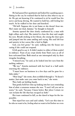 Tom gently held her chin up looking into her eyes reminding him of what a sensuous woman she was. “I won’t tell you not to worry,” he said, “because I know better. But when I return we can reclaim the life that has escaped us both.”