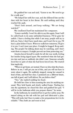 “Listen carefully. I won’t be able to say this again. Soon I will be called back to do some unfinished business. I’ll be gone for awhile. I have a feeling that while I am away, people will try to kill you. Sorry, I don’t have much time, and I won’t lie to you. I’ll have a plan before I leave. When we walk here tomorrow, I’ll give it to you. I can’t trust your place. It might be bugged. Keep smil- ing. The people I’m talking about may be watching, and I don’t want them to suspect. It might prevent me from protecting you.”