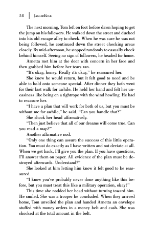 This time she nodded her head without turning toward him. He smiled. She was a trooper he concluded. When they arrived home, Tom unveiled the plan and handed Arnetta an envelope stuffed with money orders in a money belt and cash. She was shocked at the total amount in the belt.