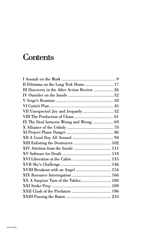 I Assault on the Mark ................................................. 9 II Dilemma on the Long Trek Home .......................... 17 III Discovery in the After Action Review .................. 26 IV Outsider on the Inside ......................................... 32 V Seige’s Reunion .................................................... 38 VI Corin’s Plan.......................................................... 45 VII Unexpected Joy and Jeopardy ............................ 52 VIII The Production of Chaos ................................... 61 IX The Deal between Wrong and Wrong ................... 69 X Alliance of the Unholy .......................................... 78 XI Project Phase Danger ........................................... 86 XII A Good Day All Around ..................................... 94 XIII Enlisting the Destroyers .................................. 102 XIV Attrition from the Inside .................................. 111 XV Software for Death ............................................ 118 XVI Liberation at the Cabin ................................... 135 XVII Sky’s Challenge .............................................. 146 XVIII Breakout with an Angel ................................ 154 XIX Resource Interrogation .................................... 166 XX A Surprise Turn of the Tables ........................... 180 XXI Strike Prep ...................................................... 189 XXII Clash of the Predators .................................... 196 XXIII Passing the Baton ......................................... 210