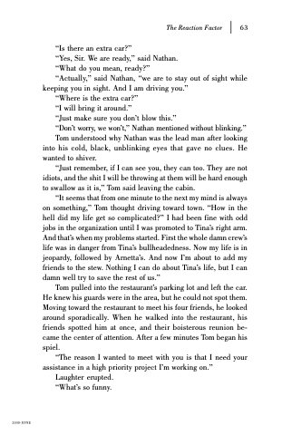 Tom pulled into the restaurant’s parking lot and left the car. He knew his guards were in the area, but he could not spot them. Moving toward the restaurant to meet his four friends, he looked around sporadically. When he walked into the restaurant, his friends spotted him at once, and their boisterous reunion be- came the center of attention. After a few minutes Tom began his spiel.