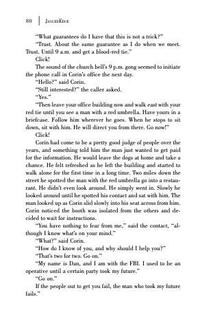 Corin had come to be a pretty good judge of people over the years, and something told him the man just wanted to get paid for the information. He would leave the dogs at home and take a chance. He felt refreshed as he left the building and started to walk alone for the first time in a long time. Two miles down the street he spotted the man with the red umbrella go into a restau- rant. He didn’t even look around. He simply went in. Slowly he looked around until he spotted his contact and sat with him. The man looked up as Corin slid slowly into his seat across from him. Corin noticed the booth was isolated from the others and de- cided to wait for instructions.