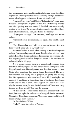 Both men looked at each other smiling. After finishing their drinks, Corin stood up to walk away. Dan finished his drink and ordered another. Corin reaffirmed his revenge on everyone who had anything to do with his daughter’s death as he held the en- velope tightly in his grip.