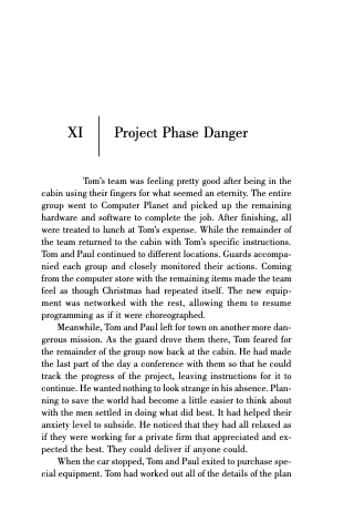 Tom’s team was feeling pretty good after being in the cabin using their fingers for what seemed an eternity. The entire group went to Computer Planet and picked up the remaining hardware and software to complete the job. After finishing, all were treated to lunch at Tom’s expense. While the remainder of the team returned to the cabin with Tom’s specific instructions. Tom and Paul continued to different locations. Guards accompa- nied each group and closely monitored their actions. Coming from the computer store with the remaining items made the team feel as though Christmas had repeated itself. The new equip- ment was networked with the rest, allowing them to resume programming as if it were choreographed.