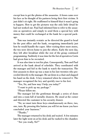 It was also time to test his plan. Consequently, Tom and Paul arrived at the bank ahead of schedule. They coordinated with the manager and hid in the bank to watch the transaction. The first assassin to show up was a man in his late twenties who pro- ceeded directly to the manager. He sat down in a chair and slapped his hand on the desk. A key remained when he removed it. The manager recognized the key and quickly rose to his feet.