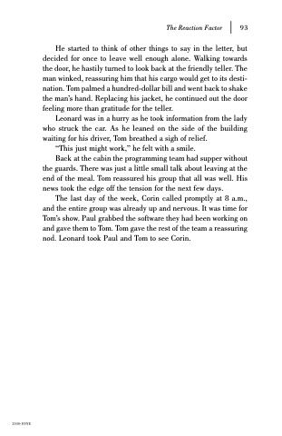 The last day of the week, Corin called promptly at 8 a.m., and the entire group was already up and nervous. It was time for Tom’s show. Paul grabbed the software they had been working on and gave them to Tom. Tom gave the rest of the team a reassuring nod. Leonard took Paul and Tom to see Corin.