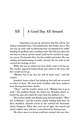 Sometimes you get up and know that this will be one of those wonderful days. For Jennifer Key, this Friday was it. The sun was up early with its blistering heat accompanied by traffic heading for gridlock and a soothing wind. She had just taken her two boys to school, and her mood could not be touched by nega- tive waves. For Jennifer Key, the day couldn’t get better. She was smiling and daydreaming in traffic, already late for work as she coveted her feelings of love.