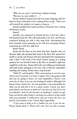 hand in front of Jennifer’s face cutting off her words. “Don’t you call yourself my mother ever again as long as . . .”