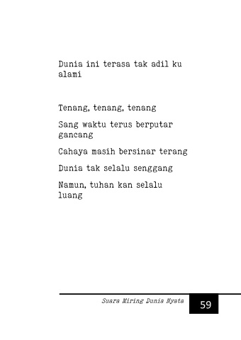 Dunia ini terasa tak adil ku alami Tenang, tenang, tenang Sang waktu terus berputar gancang Cahaya masih bersinar terang Dunia tak selalu senggang Namun, tuhan kan selalu luang Suara Miring Dunia Nyata 59
