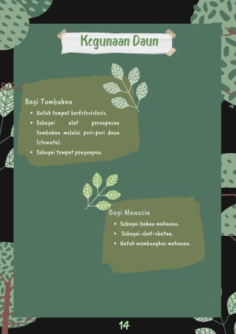 Kegunaan Daun Bagi Tumbuhan Untuk tempat berfotosistesis. Sebagai alat pernapasan tumbuhan melalui pori-pori daun (stomata). Sebagai tempat penguapan. Bagi Manusia Sebagai bahan makanan. Sebagai obat-obatan. Untuk membungkus makanan. 14