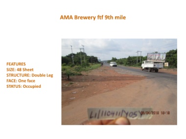 AMA Brewery ftf 9th mile FEATURES SIZE: 48 Sheet STRUCTURE: Double Leg FACE: One face STATUS: Occupied
