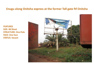 Enugu along Onitsha express at the former Toll gate ftf Onitsha FEATURES SIZE: 48 Sheet STRUCTURE: One Pole FACE: One face STATUS: Vacant